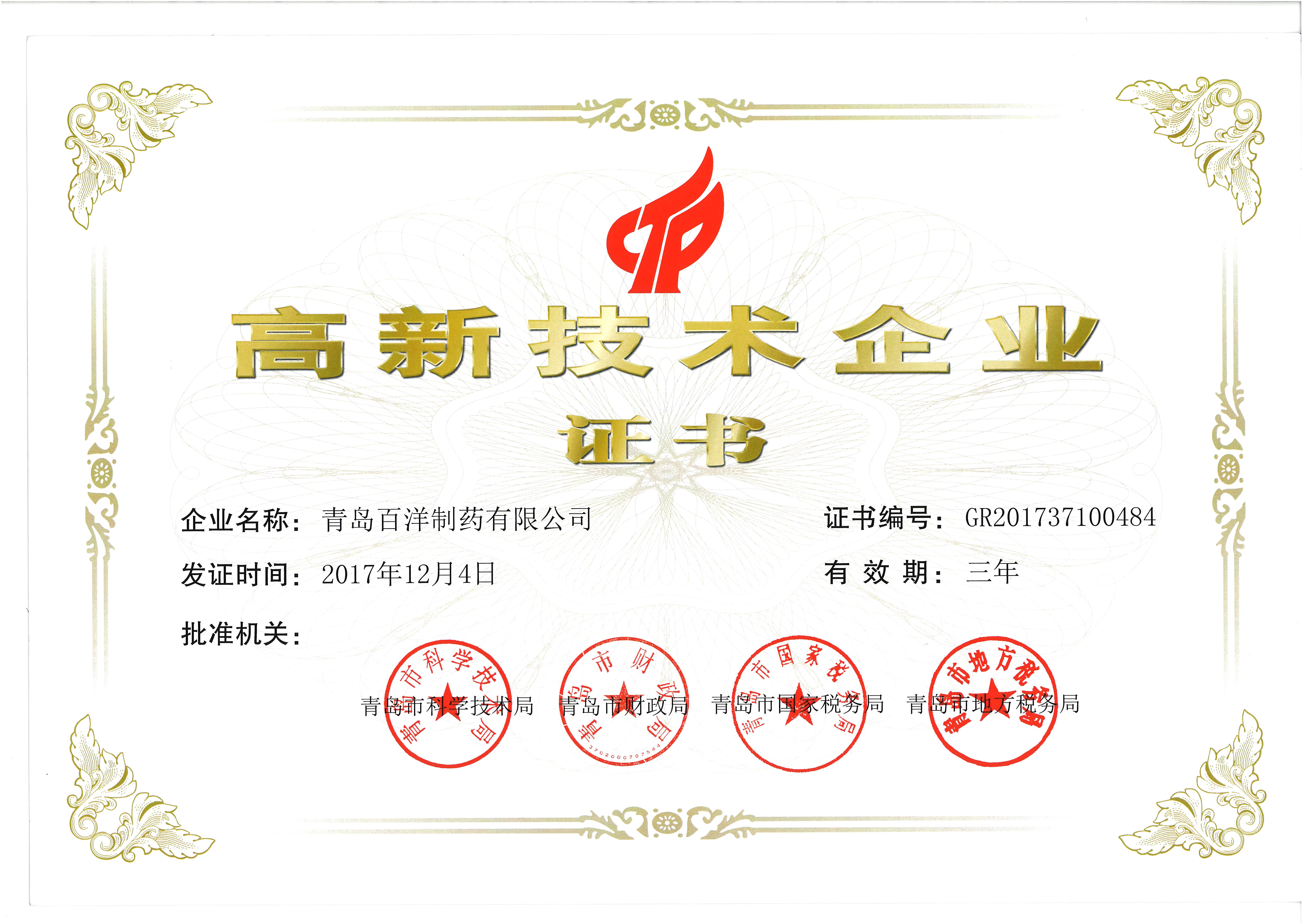 經過半年時間的資料準備,歷經多次審核及多位專家的評審,近日,青島百洋制藥有限公司順利獲得了由青島市科學技術局、財政局、市國稅局、市地稅局聯合頒發的《高新技術企業證書》,成為青島市高新技術企業。